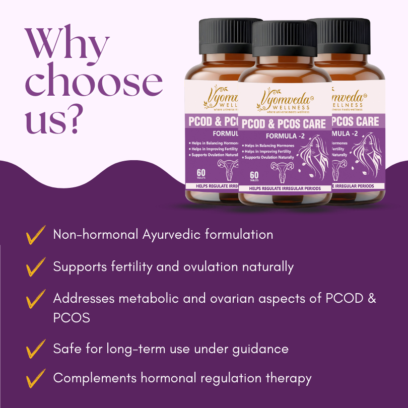 Vyomveda Wellness PCOD & PCOS Care – Formula-2 is an advanced Ayurvedic formulation specially developed to support ovarian health, natural ovulation, fertility potential, and metabolic balance in women affected by PCOD / PCOS.